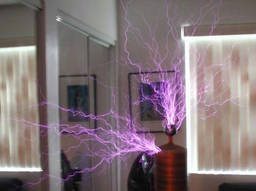 | Early Testing of "Prague Coil". Maximum output of 9" diameter x 2.5" tall coils is a 16" Flaming Discharge. |