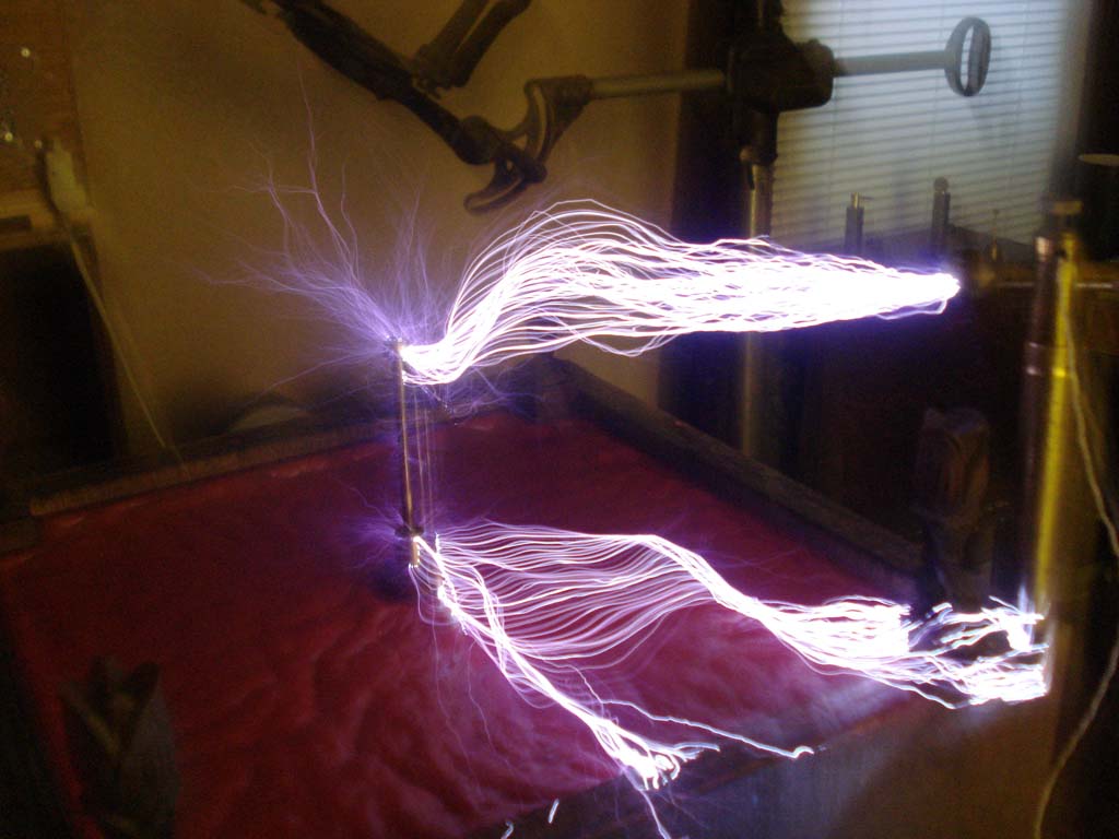Museum http://www.electrotherapymuseum.com Nine Inch Pancake Coil giving Nine Inch Discharges... 02. - 04. May 2009 ![]() I was using a new crude silicone mold I made to revisit (and re-pot) a Pancake Coil that I wound in late January of 2002. Frank was on the phone, and I connected the coil to my tuner to see how it functioned on low power. I was surprised to get nearly 6" sparks with less than 100 watts. Went to Home Depot and bought some bargain bin wood... Made a box. This time I took some care to put an on-off switch and a detachable mains plug... I even soldered together a $#(%(#$* MMC cap. I hate soldering. My circuit board was a piece of cherry moulding. The 1250V transformer is from a small TIG welding high frequency arc stabilizer (Miller). Its a nice transformer built for industrial use - RF arc starting is nothing more than a continuous duty d'Arsonval coil coupled to the welding cable with some blocking caps to protect things. Many thanks to Brian Foley for the caps, they are rated .22 mfd at 1kVDC...4 in series for .056 mfd at 4kVDC. Tungsten Spark gap is from H. G. Fischer, mounted to G10 base. Indifferent spark post connected to one leg of primary / outermost secondary winding. After testing, found out I didn't put enough wax! Nice! OOPs... For safety of coil insulation, discharge is limited to 7". |