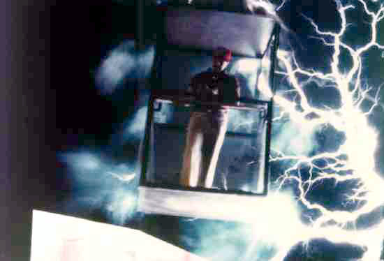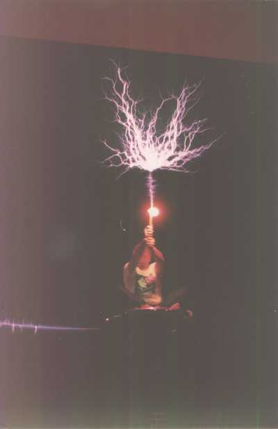 Bill Wysock on pedestal connected by transmission line to a Model 5D Tesla Coil at 1992
