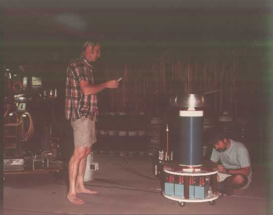 Circa 1988; Bill Wysock (left) and Lowell Beezley (right) working on Model 5D Tesla Coil.